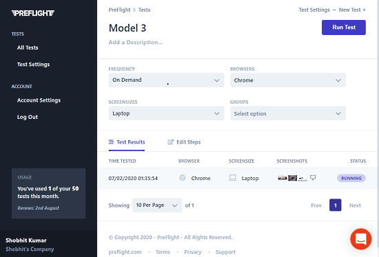 You can access all your tests in the Preflight dashboard. From there, you can schedule a test run for a specific interval. You can run the test manually as well. For each run, you can choose the browser of choice and screen size. After initiating the test, you can track its progress on the dashboard. You can check the screenshots taken by the test.