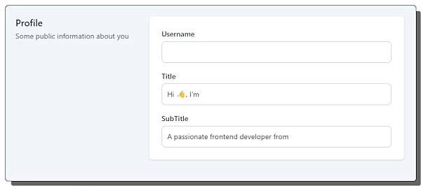 The profile section includes personal information. It has input sections for username, title, and subtitle. Users can simply add the desired information to create a profile.