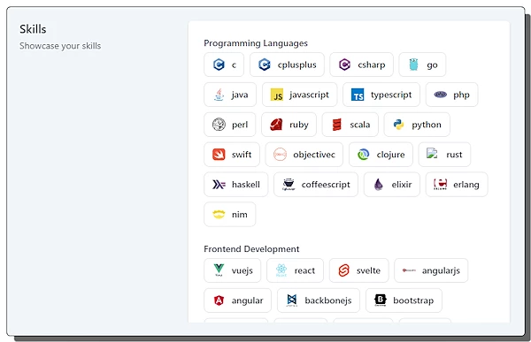 The section section is Skills. It covers over 60 core languages, frameworks, backend technologies, and Web3 tech. The listing is divided into various parts where users can click and select the technologies they have experience with.