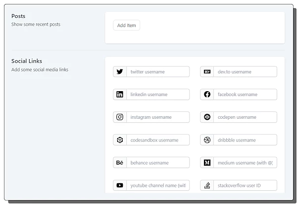 The next section is Posts and Social Links. In this section, users can include their external links to show their recent posts. Along with that, it provides 12 social media sections to add profile links to Twitter, StackOverflow, YouTube, Behance, Instagram, Dev.to, LinkedIn, Facebook, Codepan, Dribble, Codesandbox, and Medium.