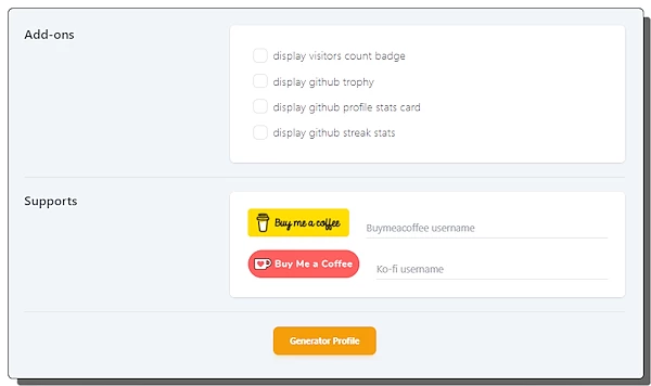 Last but not least, users can add support links to Bymeacoffee and Ko-fi where visitors can contribute by donation. In addition to that, users can toggle visitor count badge, GitHub Trophy, GitHub Profile Stats Card, and GitHub Streak Stats on their profile.