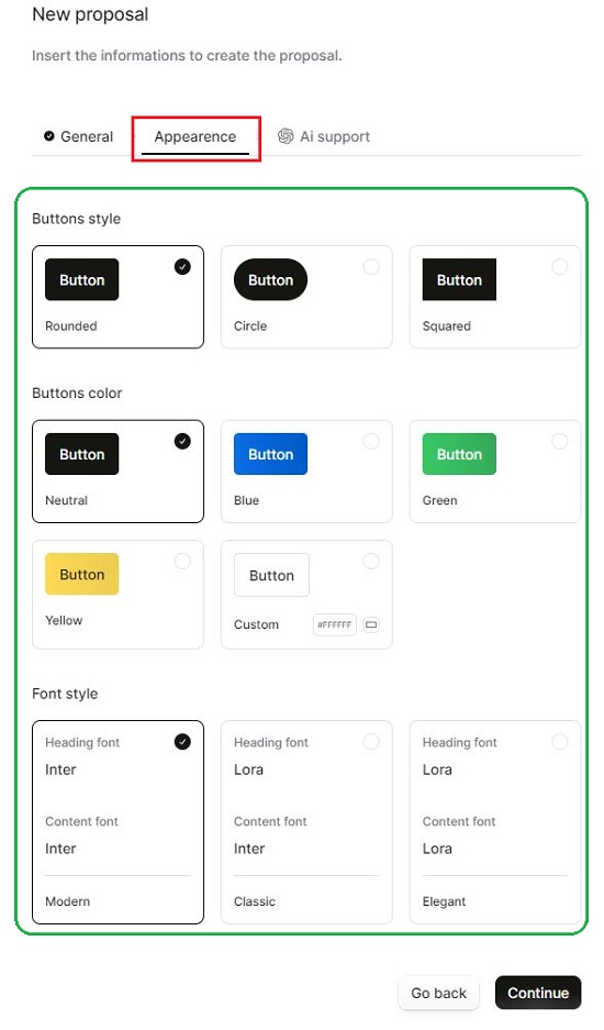 4. Choose the Button Style, Font Style, Heading Fonts and more in the appearance section and then click on ‘Continue’.