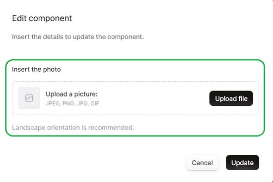 10. Likewise, to add Photos to the Proposal at the suggested places, hover your mouse over the corresponding section, click on the Edit icon and then click on ‘Upload file’ to upload any image from your local computer in JPG, PNG, or GIF file format. In the same way, you can Edit any tables that may have been included in the proposal and modify the Row title and Text content.