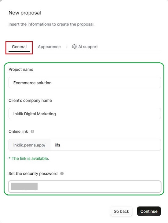 3. Assign a name to the Project, input the Client’s Company name and set the Security Password. You must also complete the ‘Online Link’ field which will be the URL of the proposal that the client will use to see the Project live. Click on ‘Continue’ to go to next screen where you must configure the appearance of the proposal.