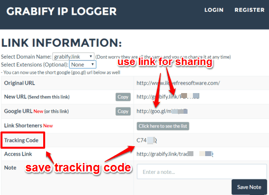 Step 2: Your new URL will be generated quickly. If you want, you can also change the domain name (optional). Available domain names are: grabify.link, gyazoo.ml, join.ga, imager.cf, etc. Along with the new URL, you can also see the Original and short URL (Google URL). It is your choice which URL you want to use for sharing. Also, there will be a “Tracking Code” which is very important. Copy and save that code. You will need that code to track URL stats.
