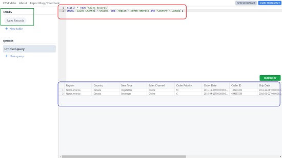 - Sharing: You can share the CSVFiddle Workspace with anyone by means of a URL. The CSV Data and its queries and references are encoded in the URL, so the shared data is not sent to the servers and is secure.