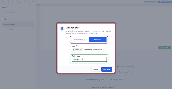 2. Click on ‘New Table’, upload the CSV File from your local disk, provide a Name to the Table and click on ‘Add Table’. Alternatively, you can also specify the URL where the CSV file is located.