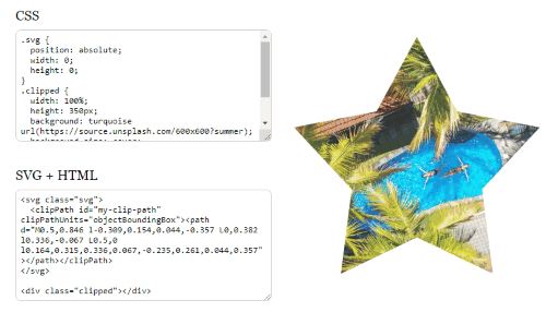 For instance, if I click on the Star shape, it automatically inserts the clip-path. Below, you can see the live demos as well. It shows the SVG with initial path, clip-path with initial, and clip-path with relative paths.