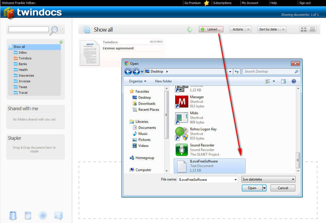 If you installed clients, then use them to upload documents that you want store and file online, otherwise, if you’re using the browser access, to start the upload click on the Upload button which is located near the center of the screen.