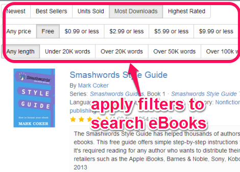 To use this service, go to the homepage of Smashwords. On its homepage, it will show you mix up of free and paid eBooks. But you can add filter to find the relevant books only. For example, if you want only free eBooks on its homepage, then just click on Free button, like visible in screenshot below. Similarly, other filters can be applied. If you have to search eBooks according to best seller, most downloads, highest rated etc., you can apply filter according to your need.