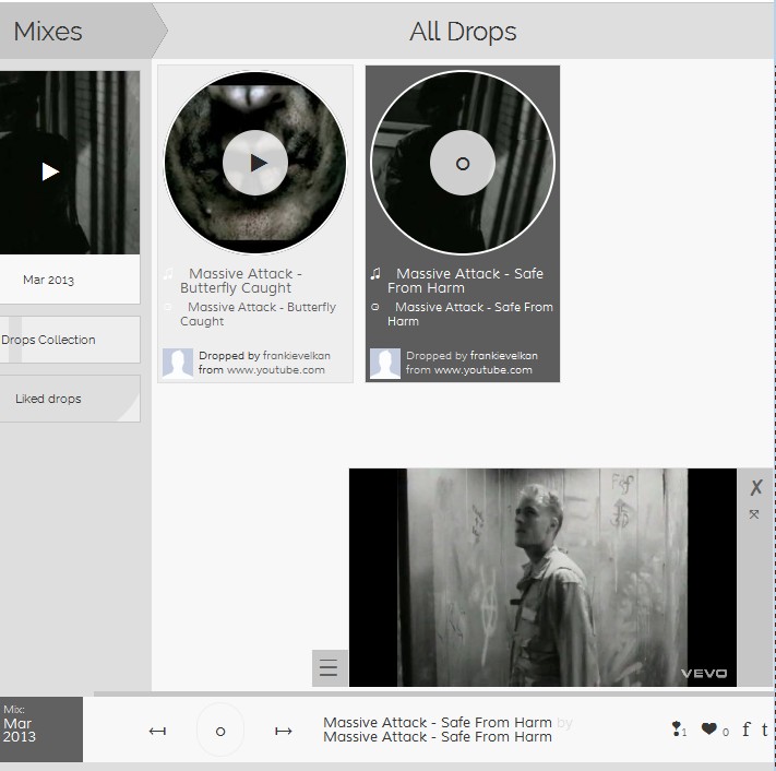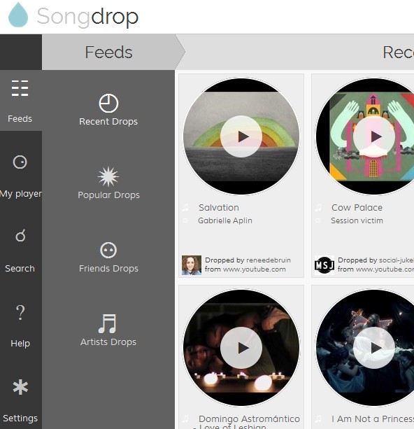 Songs can be played by using the music player, click on the My Player button to activate it. Notice that the music thumbnails have play marks on them, left click on them is gonna activate the player. If the song is from YouTube or any other video streaming website video preview will also pop up in the bottom right corner. It can be removed if you right click on the close button left of it, so that only the audio is being streamed. Music from your friends and other SongDrop users can be played from the Feeds section, which can be seen from the first image above. Again the only thing that you need to do is clicking on play and enjoy the music.