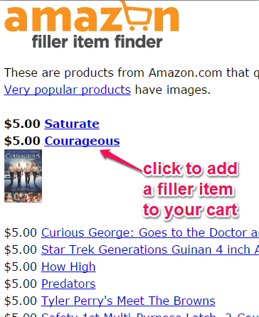 You need to enter the amount for free shipping, and then this website will provide you list of suggested products. You can select any product to add it to your cart and complete the target of free shipping with that filler item.
