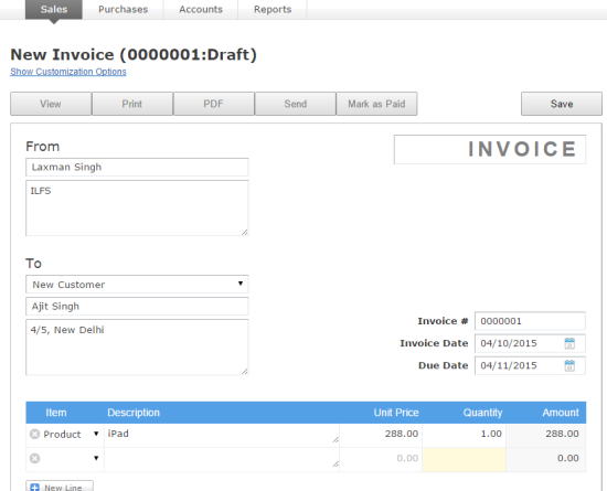 Zoho Invoice also provides a beautiful template to quickly create the invoice and take print of that invoice without any sign up. However, if you create a free account, then you will get more benefits. For example, you can send unlimited invoices to 5 customers, can attach files (5 MB) with invoices, and connect multiple services for payment. PayPal, Authorize.net, stripe, forte, etc. services can be used.