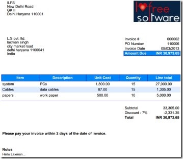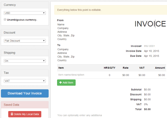 Free Invoice Generator comes with a very simple invoice template, but it is good to quickly generate your invoice with all items. The unique feature in this website is that you can delete your local data after downloading the PDF file of your invoice. The template supports multiple currencies, let you add discount (if needed), enable/disable shipping charges, and insert flat tax or VAT. So invoice template is good enough to use.