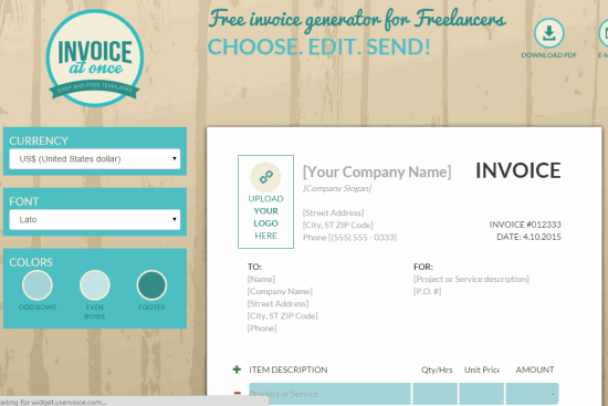 Invoiceatonce.com provides a very beautiful interface and an elegant template to create a custom invoice. Unique feature of this website is that you can select a particular font and desired colors in invoice. Rest of the important fields are already added in which you need to add details. After preparing the invoice, you can download the PDF file and email it to recipient.