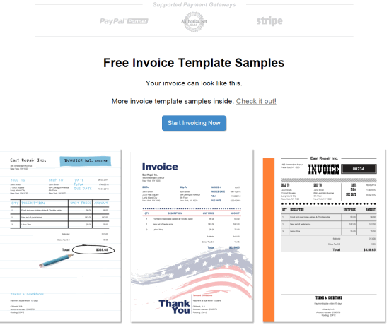 Invoicehome.com provides more than 100 beautiful invoice templates. You can download the prepared template (as Excel or PDF), send it to recipient via email, and can also save your templates online. Interesting feature that comes with this website is that you can allow your clients (say payers) to pay the bill online. For this, you can either connect your PayPal or Authorize.Net account.