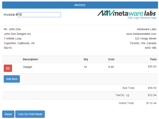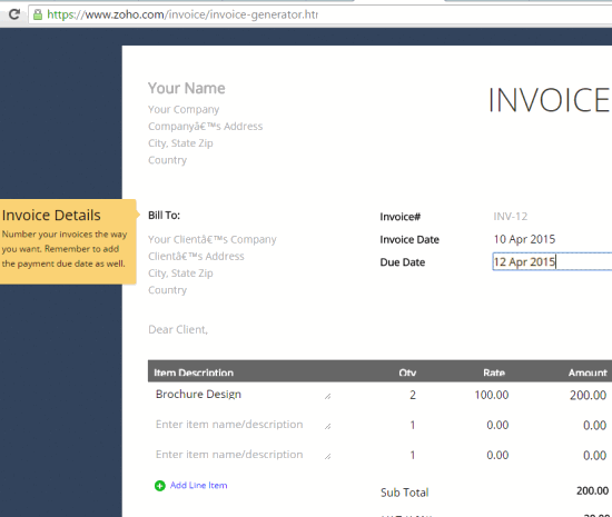 Invoiceto.me is also a very easy to use website that provides only one invoice template. It supports a table where all fields are available for items. You can also delete rows or add new rows in table. All fields in the template are editable, so you can create a custom invoice for you. You won’t find advanced features in this website, but its a quick way to generate invoice and download to PC as PDF.