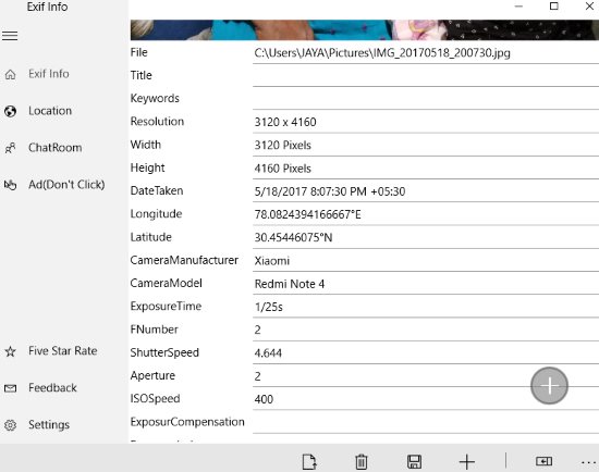 The app will give you options in a toolbar given at the bottom of the app window. From there choose the open file option to browse and select a photo whose exif information you want to view or want to modify. The selected photo will open up in the app and below that you will be able to see all the exif information of the photo which is available.