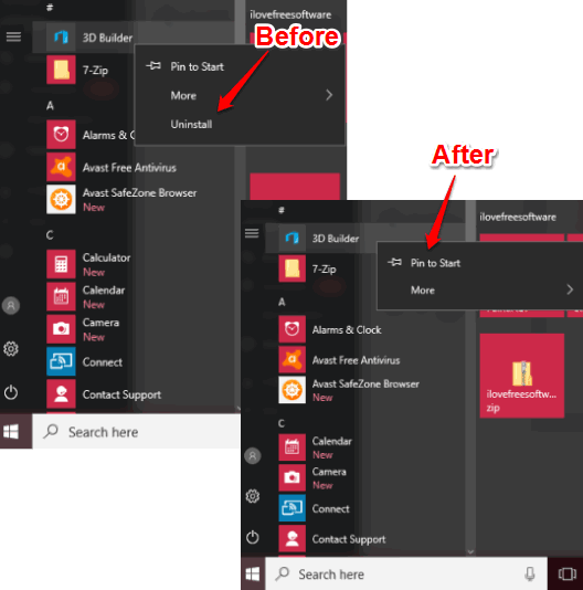 This tutorial explains how to disable uninstalling applications from Start menu in Windows 10. This trick can be applied using two built-in features of Windows 10: Registry and Local Group Policy. When this trick is applied and you right-click on some app or program, then Uninstall option won’t visible, which is actually visible otherwise. As a result, you won’t be able to uninstall any application or app using Windows 10 Start menu. This trick also works on tiles pinned to Start menu.