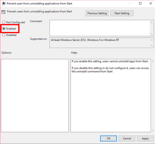 Step 4: Prevent users from uninstalling….. window will open. There you will see an Enabled option at the left side. Select it and then apply this change.