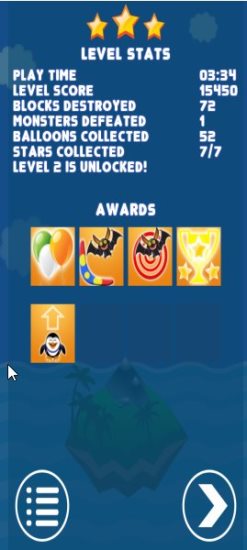 The level up screen will show you your total score in the level, number of blocks that you destroyed, monsters defeated, balloons collected, stars collected, play time, awards, etc. Click the next arrow to start playing the next level.