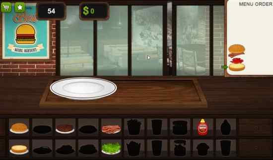 The above screenshot shows you the ingredients of level one at the bottom of this window. The menu order window on the top right corner will show you how the burger is supposed to be made, meaning which ingredient goes into the burger in which order. This is like a customer order. There is also a timer running next to the money tab. You have to serve as many burgers as you can in that amount of time to reach your level goal.