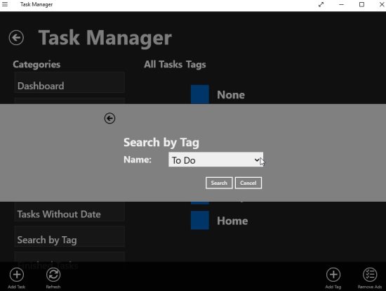 Now this task you added will start appearing in your home screen window. If you have too many tasks listed on the home page, then you can easily search for a particular task using tags. Just go to your home screen and click on the search by tags button on the left side. This will open a window like the one shown in the screenshot below.