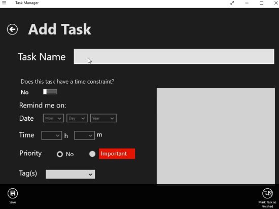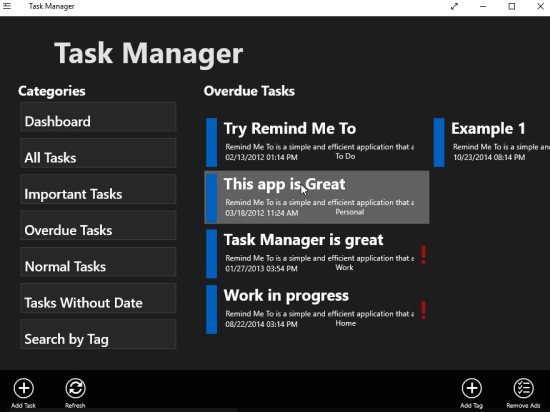 Free task manager for Windows 10 is a easy app to try and maintain everyday tasks easily. You can add a task and set a reminder with it, and can be sure that you will not forget your task ever.