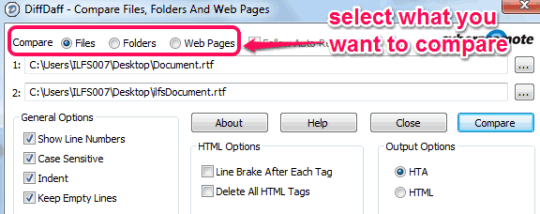 - Output Options: There are two kinds of output options available: HTML and HTA. HTML output lets you view comparison result as an html file in your default web browser. On the other hand, HTA option helps to open a new window (provided by this software) to view the result.