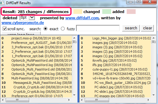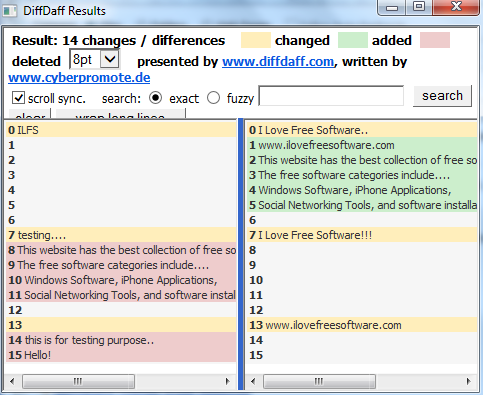 DiffDaff is a free software that helps to compare text files, html files, folders, and webpages. It can compare two same file types or different file types at a time and highlight differences with yellow color. Apart from this, it also shows deleted content (in red color) and content added in green color in a particular file. So this could be quite useful for programmers, as well as for common users, to check the differences between two files.