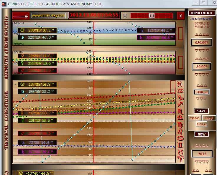 Genius Loci is a free astrology software for people interested in scientific astrology, as it offers a great opportunity to better understand the hidden context of Celestial Mechanics. Genius Loci shows the Azimuth and Altitude traditionally called as mathematical and refracted values along with the Tropical Longitudes of Planets of our solar system. As the planets are considered to be present in the Troposphere or in other words in the horizontal coordinate system makes an important way for the celestial phenomenon. And many people are greatly interested in theses celestial phenomenon and learn to calculate the various mechanics of Celestial between the 1000 AD and 3000 AD. Genius Loci can calculate the different time frames with geo coordinates which are easily adjustable.