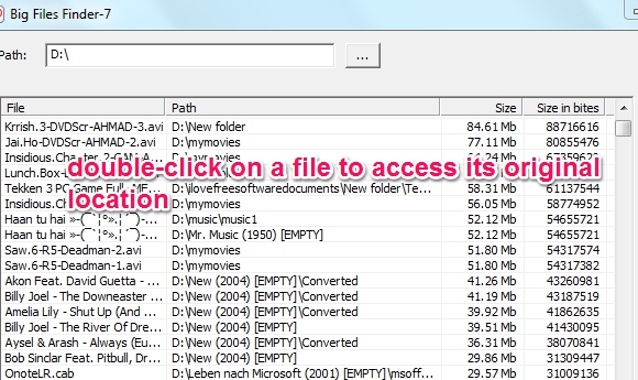Big Files Finder-7 is a freeware for Windows that helps to automatically find large files on PC in a single click. Manually it could be time-consuming to search for files, folders, and sub-folders having big files. But with this freeware, it is just a matter of seconds to find large files. It lets you select any hard drive or flash drive and starts a scan. All results will be in front of you with files name, path, size on disk, and size in bytes.