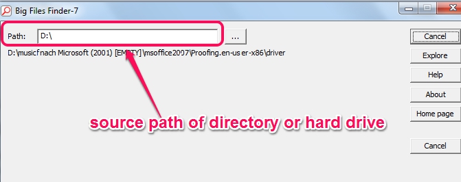 Its interface is very simple where you have to enter source path of directory or disk drive using Browse button. After providing the source path, hit the Find button and it will start scanning that directory/disk drive for big files.