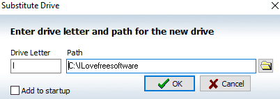 To create a virtual hard drive, click on the “Create substitute drive letter for local folder” option. After that, a dialog box will appear in which you will have to specify the drive letter and local folder path, as shown in the screenshot below. It will then create a virtual hard drive of that folder and you can also see it in the Windows Explorer.