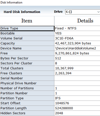Getting started with this free drive manager is really easy, just download it from the link provided at the end of this review and install it. After that, you will see its main interface, as shown in the screenshot above. It automatically displays all of your local, portable, and network drives on its main interface. The way it displays all of your hard drives makes it easier for you to identify each one of them by their product or vendor ID. Apart from that, you can view more additional info related to a hard drive, like, bytes per second, sectors per cluster, total number of partitions, start offset, hidden sectors, etc. To view additional info of a hard drive, select a drive and then click on the Disk Info button. It will then display all of the additional info of that hard drive, as you can see in the screenshot below.