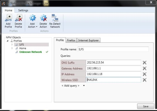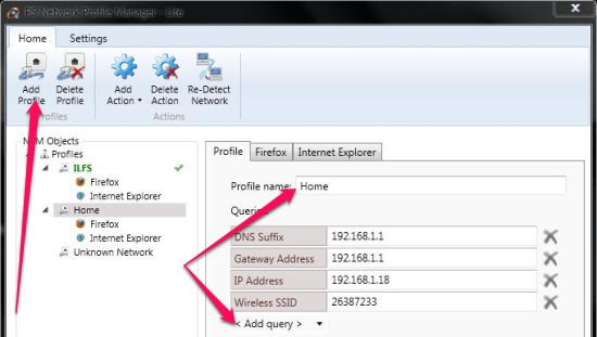 To create a profile, click on the “Add Profile” button on the top left and click on “Add Query” to add the information in to the profile. The default would be “Unknown Network”, however this would change according to the network profile you wish to switch to.