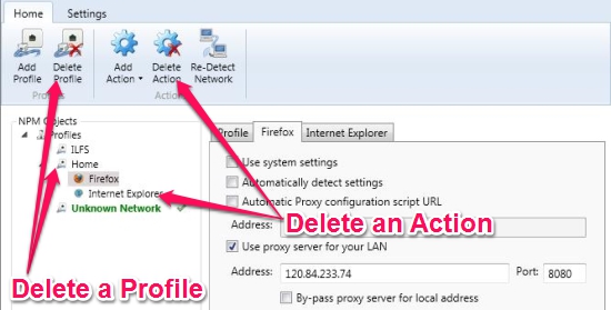 You can configure the home page and proxy address for the browser right from the Network Profile Manager. To configure your browser automatically while you switch profile, click on “Add Action” and choose your browser. [Note: If you’re using Google Chrome and change the settings for Internet Explorer and it would affect Google Chrome too.]