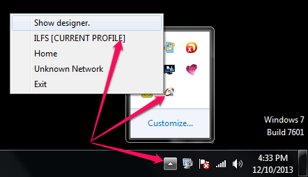 Switching profiles in this network profile manager is as simple as right-clicking on its icon that appears in the system tray and choosing the right profile that matches your network. To access the main interface to add a profile or make any changes to the current or any other profile, click on “Show designer”.