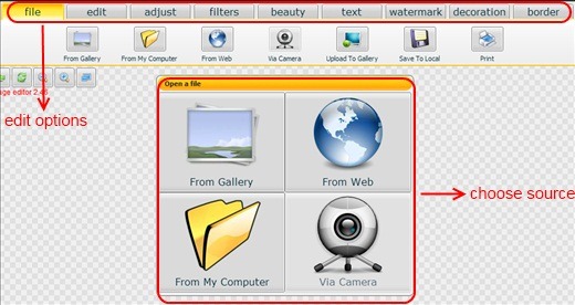 Photo Editor Online is a Chrome app which you can use to edit your photos. It has all the basic filter options. Other than that you can add text, watermark, decoration, border etc. This app provides unlimited undo, redo options. Also zoom in/out option and full screen window facility is there. The best thing is that you have options to choose the source like from your computer, gallery, web and via camera. Though there is an option to provide URL of image, it didn’t work for me. However it has more or less everything a basic photo editing app should have.