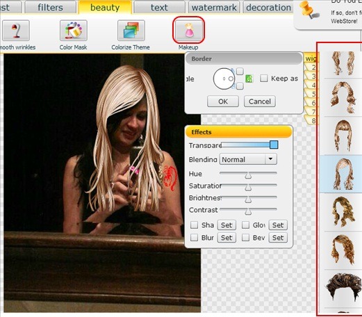 The above image shows the make up options. this picture has been edited using wig, tattoo and false art. Then, you can add text: basic text, art text, or chat boxes.