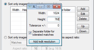 Click on the Add button from the right side of the list. Small window is gonna pop-up where you can add the resolution that you’re interested in sorting. Do this for every resolutions, they’re gonna be added to the list. Again, when you’re done setting up everything click Go, wait for the sorting to complete and open up the output directory.