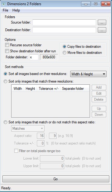 Dimensions 2 Folders is a free image sorting software for Windows which you can use to automatically sort images and photos into folders based on their resolution. Dimensions 2 Folders offers 3 different methods of how images can be sorted. Either by automatically sorting all the images from a certain directory, each resolution into a different directory, by sorting only certain images that have a certain resolution or by sorting them based on their aspect ratios. Let’s see how each one of them works.