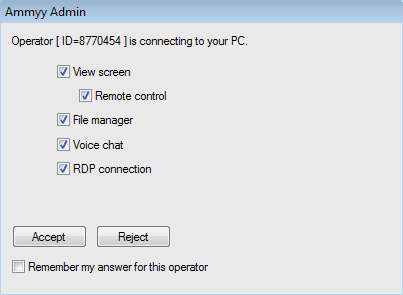 Here you can determine what kind of privileges people who are connecting to your PC will have. We’re gonna leave everything marked and click Accept. In order to restrict the operator, uncheck options as you see fit and then click Accept. The following window should appear on the operator machine, the one that’s not the client: