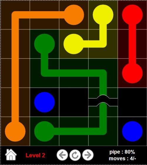 As you can see all you have to do is connect the same colored pipes in as fewer moves as possible to score high. There are bridges provided in the game if two or more pipes have to go through the same route. Once you complete a level you get the option to play the level again if you think you could have finished that particular game in fewer moves than before.