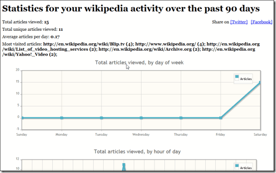WikiStats is a pretty simple Wikipedia extension for Firefox that tracks how many Wikipedia articles have you read over the last 90 days. It will show total number of articles you read on Wikipedia in a span of 90 days. It also shows a nice graph that shows the number of articles you read everyday. In fact, you can also see the number of articles read by hour of the day. In addition to this, it also shows the articles that you read most (in case you read the same article multiple times), and number of times article read.