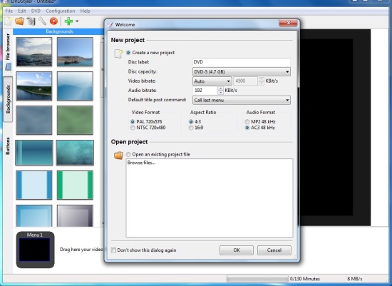 Overall DVD creation process is pretty simple. The interface lists three different tabs on the extreme left. To start with, you can create a new project, enter a disc label, video format, and audio/video bitrates.