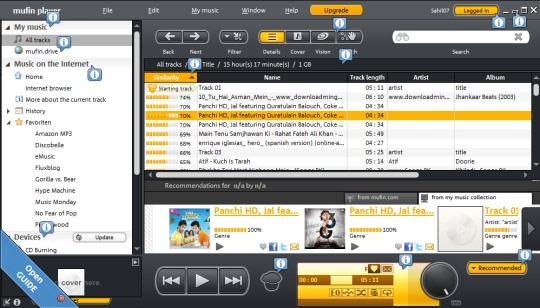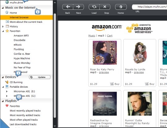 At the navigation bar of mufin player, all the important options will be available to you. Options such as to view all added tracks, access integrated web browser, CD burner, view connected portable devices (like memory card of your phone) data, create playlist, view most recently played tracks/added tracks/downloaded tracks etc.