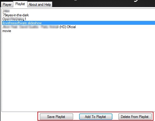 At the bottom right side, you will find basic options such as to enable auto play music, shuffle media files to play them randomly and repeat them. But before playing any song or video file, you first have to add them to playlist which you can save also. Access Playlist tab present at top left side to add media files to play. On Playlist tab, you will find add to playlist tab to add audio video files, delete tab to delete unwanted files and Save Playlist tab to save added files.