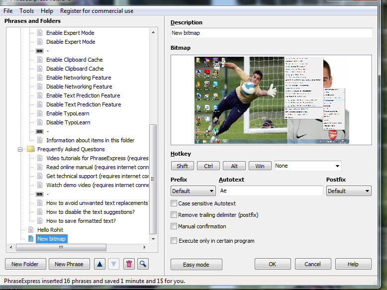A description of the phrase that you want to replace is asked. The Hotkey associated with it must also be specified. Auto text or the abbreviation must be set then. A default prefix and postfix expression which may come before or after the Autotext must be set too! Options of making the Autotext case sensitive and Manual confirmation are present. After typing the phrase on my document it got automatically replaced by the Autotext.