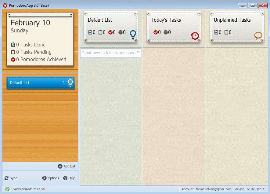 Interface of this task management software can be seen in the image above. It consists of four columns. The one all the way to the left holds status report on the number of completed tasks, tasks which are pending, task list and all the way at the bottom you can see access options. The other three columns on the right are reserved, for listing tasks of the currently selected task list, first one on the left, for arranging the list of tasks that you’ll be completing for the day, the one in the middle and for adding unplanned tasks, the one on the right.